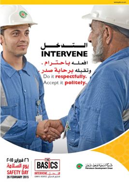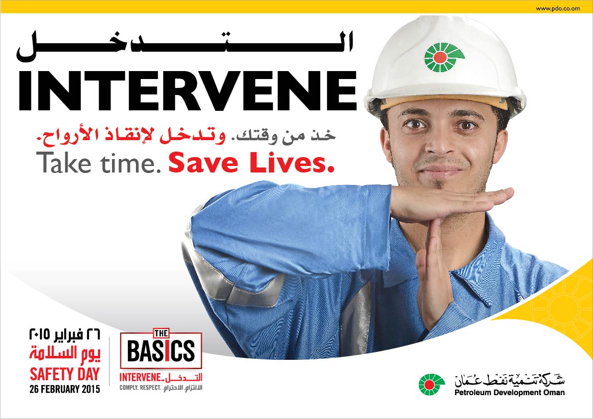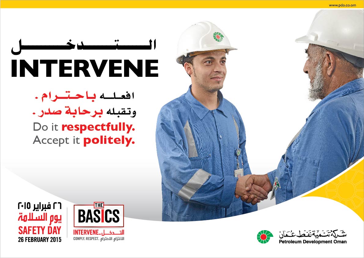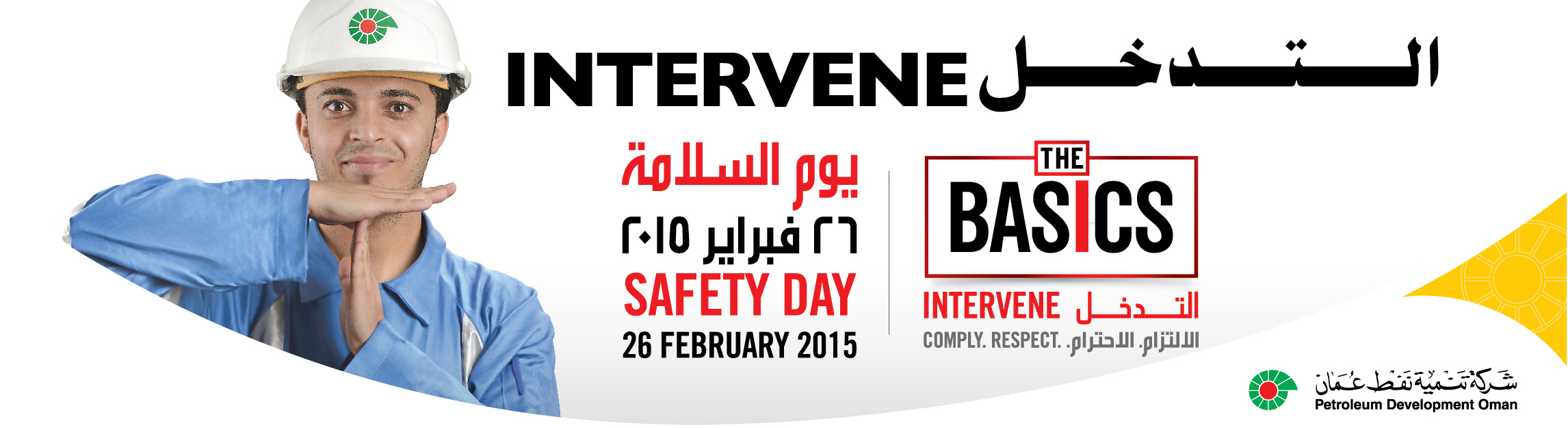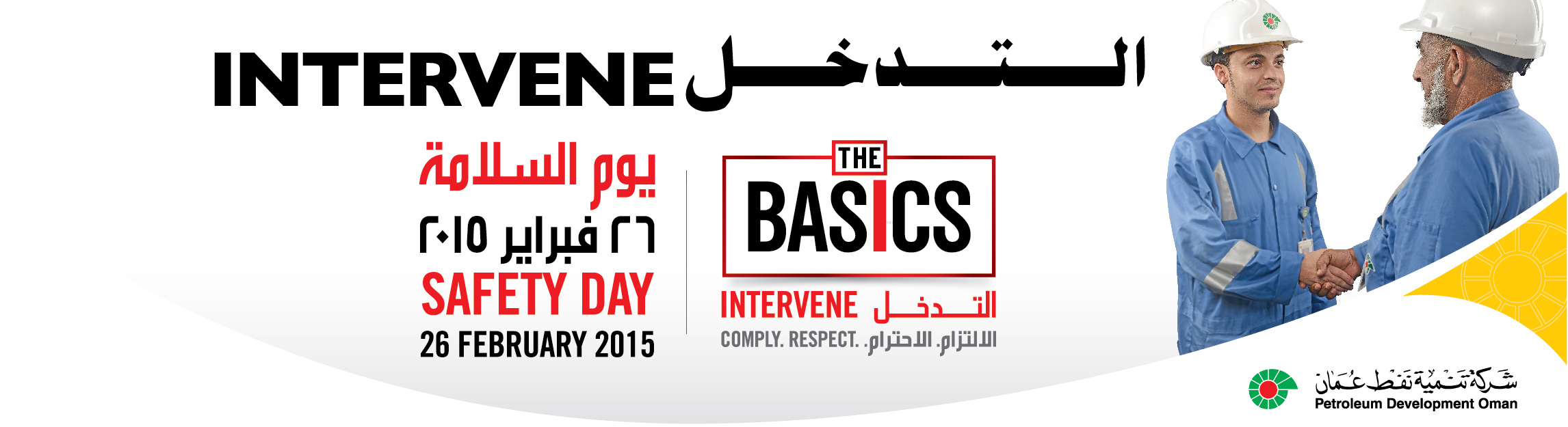 The 2015 Safety Day theme is follow-up on “THE BASICS” theme of last year where we focused on "Comply" the first pillar of PDO's 3 golden rules. This year we will focus on Intervene, the second pillar of the Golden Rules - the foundation of HSE rules in our Organization and operations. Safety is core value in PDO and is overarching priority in everything we do in our operations. Our safety performance relies on all of us understanding the basics, e.g. rules, procedures, standards etc and carrying out our day to day activities in a safe manner.