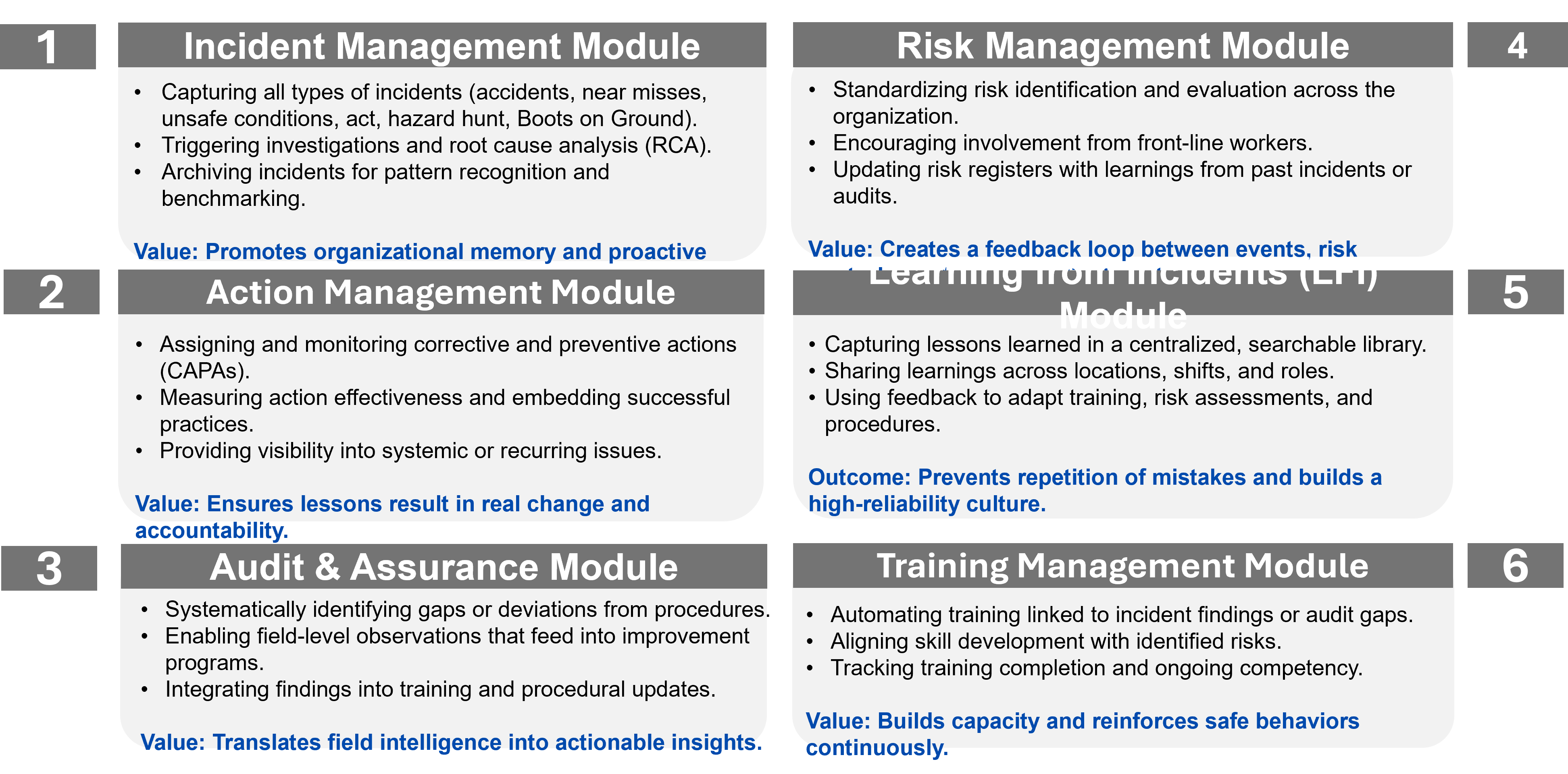 By centralizing critical HSE elements—such as incident data, audit findings, lessons learned, risk assessments, Management of Change (MoC), Act insights, and safety observations
